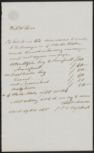 This is a letter, "Brief aan Pieter Verloren van Themaat," written by Johannes Pieter van Wisselingh in 1861. Van Wisselingh, active in the mid-19th century, lived in a time of increasing industrialization and social change in the Netherlands. This letter gives us an intimate glimpse into the art market of the time, listing several landscape paintings with their prices. The act of pricing and selling art reflects the commercialization of artistic expression, where the value of art is determined not only by its aesthetic qualities but also by market forces. What does it mean to assign a monetary value to a landscape, to a scene? Landscape painting often reflects cultural values and perceptions of nature. This letter invites us to think about how these landscapes, and the act of their sale, intersect with broader issues of commerce, value, and cultural identity. It allows us to consider the emotional weight and implications of the art world at the time.