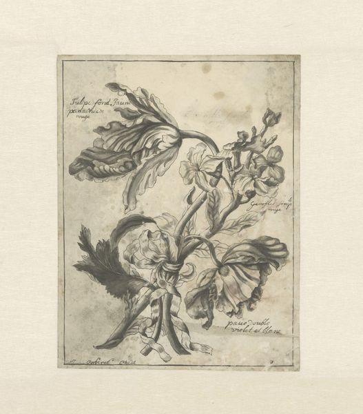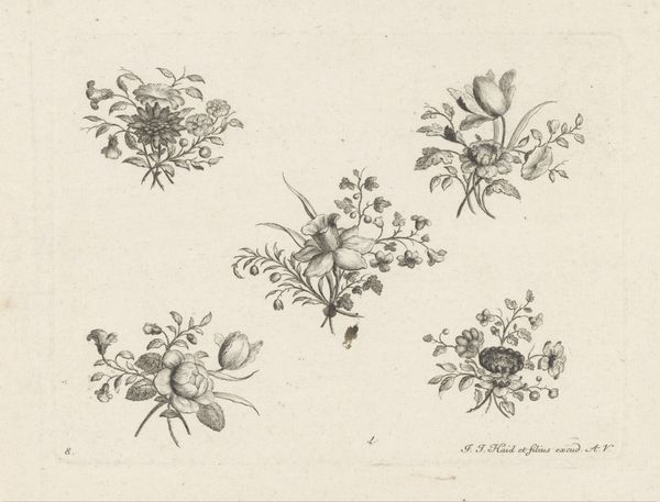 Curator: At first glance, it looks quite delicate. Editor: Indeed. What we have here is "Diverse bloemen," or "Diverse Flowers," attributed to Johann Christoph Nabholz, created sometime between 1762 and 1797. It's a print, using both engraving and pencil sketch on paper, currently held in the Rijksmuseum. Curator: The combination of engraving and pencil work makes you consider the social status of printmaking in that period. How did the addition of pencil alter the accessibility and potential economic value of these works? It softens the traditionally graphic qualities of engraving with softer lines. Editor: The rise of the print market in the 18th century truly democratized art consumption. Works like this circulated widely, and that distribution had a massive influence on broader taste and aesthetic values across society. Botanical illustration, especially, became popular for both artistic and scientific interest. Curator: It’s fascinating how the rendering balances scientific observation with artistic flourish. Look at the detailing in the petals; you see the artist demonstrating a keen understanding of their structure, but without losing their appeal in conveying botanical knowledge as a refined skill or domestic hobby for the merchant and artisan classes. Editor: Precisely. Think of the printmaker's role in disseminating scientific understanding alongside aesthetics. A piece like this demonstrates the intertwined functions of art and science in the period's intellectual climate. How social institutions validated botanical illustration, which eventually turned into popular home decoration that elevated artisans. Curator: Looking closely at the medium, the marks on the paper itself, show the trace of age, watermarks... Editor: Yes, and such details help trace provenance and reconstruct the social context in which this piece was collected, viewed, and appreciated over centuries. Curator: Reflecting on it, considering its medium and intent gives insight into the complex dance of commerce and skill in the history of printed images. Editor: And for me, it shows how accessible art informed not only artistic trends but broader shifts in social values as well.