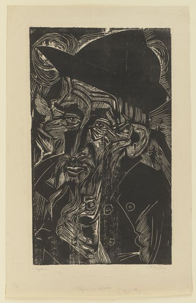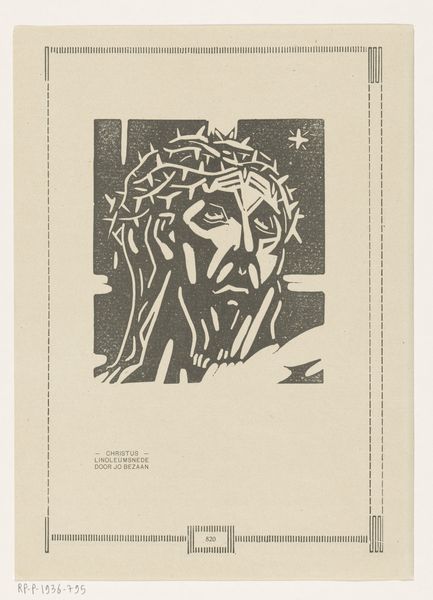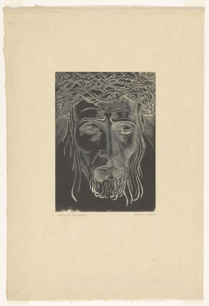 Editor: We’re looking at Lodewijk Schelfhout's "Head of Christ with Halo," a woodcut print from 1924 housed here at the Rijksmuseum. The monochrome and linear rendering really strikes me. It's so austere, almost unsettling. How do you interpret this work through the lens of its visual elements? Curator: Indeed. Consider the stark contrast—the sharp black lines carving out form from the pale void. The compressed planes of the face are striking. Notice how the aureole isn’t softly luminous but aggressively radiating, constructed of hard, unmodulated lines. Does this aesthetic choice resonate with any formal qualities typical of Expressionist printmaking? Editor: I see what you mean! The geometric planes composing his face feel almost… Cubist? And the harsh, raw lines defining the halo are definitely Expressionistic. It almost looks like broken glass radiating from his head. Curator: Precisely. Note the almost brutal simplification of the facial features. The eyes, mere slits; the mouth, a compressed line. These aren’t details meant to humanize, but rather to deconstruct. Could we interpret this abstraction not as reverence, but as an exploration of form, an exercise in reducing an iconic image to its graphic essence? The texture, achieved through the woodcut medium, emphasizes this stark quality. Editor: So, instead of the usual sympathetic or divine portrayal of Christ, Schelfhout prioritizes line, form and material, making us confront the very construction of the image itself. I’d never considered approaching a religious subject so analytically! Curator: It invites us to contemplate the intersection of the spiritual and the formal—challenging the assumed narrative through the materiality of the work. It encourages a reconsideration of how meaning is produced.