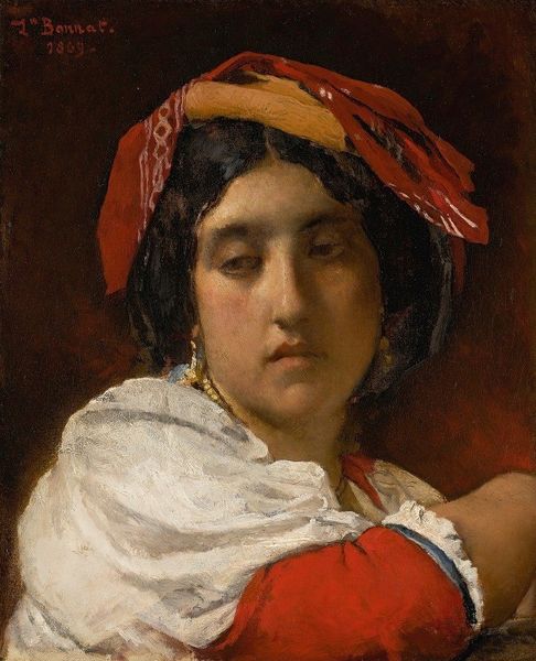 Léon Bonnat created this artwork with oil on canvas, employing traditional artistic materials to depict a figure in contemplative repose. Bonnat's use of paint is masterful; he carefully builds up layers to define the sitter’s features and clothing, and the fabric of her headdress is brought to life with textured brushstrokes. Observe how the weight of the paint gives a tactile quality to the woman's garments, emphasizing their materiality. The beads and earrings also draw attention to the woman's adornments and their relationship to her economic standing. The rich colors and controlled application of the paint suggest careful labor, in contrast to the simple attire of the sitter. Through his artistic skill, Bonnat elevates the ordinary, inviting viewers to reflect on the often-unseen work and dedication behind everyday life. This image is a reminder of the interconnectedness of artistry, labor, and representation, revealing how the value and meaning of objects and artworks lie in both their creation and their context.
