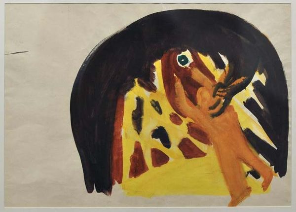 Curator: "Wild Horse Rider," we believe it’s a lithograph print by Karel Appel. What grabs you first? Editor: Well, pure, primal energy, honestly! Look at those colours— the boldness of that cadmium red. It’s unsettling and lively. Feels like something untamed is about to burst out of the frame, barely held back by the… paper, I guess. Curator: It’s that tension between raw expression and the constraint of the medium that fascinates me. Appel was a CoBrA group founder, a movement that stood for spontaneous creation and child-like wonder. Editor: CoBrA, yes. Looking at this, I immediately wonder about the process. Was this stone lithography or perhaps metal plate? And look at the layers. Each block must have been meticulously prepared, even if the final result appears… carefree. Someone spent time on the surface, negotiating this process— Curator: Negotiating, I like that! It also speaks of humanity. In Appel's work, there is a struggle but always a hint of joy. That figure, that rider. A kind of mythical, slightly demented centaur, battling with forces we can't quite name, right? Editor: And that monochrome look simplifies everything. It all goes back to the materials, right? What was available, what could be done efficiently, the costs, where this print would ultimately circulate… Even the expressive gesture is rooted in a very physical and economical reality, that dictates the available colours. Curator: Right, like a conversation happening on that very paper. Every layer adds something— some urgency and truth! Like it's always just *happening.* Editor: Well, seeing how all those materials meet can change everything about how we see this— and I guess, that makes this "Wild Horse Rider" forever unfixed, isn't it? A process rather than an image. Curator: Yes, a glorious struggle, immortalised for us. I can't look away! Editor: And I'm now desperate to see the actual lithographic plates. Thanks, Appel!
