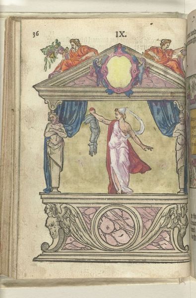 Curator: Antoni van Leest created this drawing, dating back to 1578-1579, called "Toneel met de personificatie van Vrijgevigheid", or "Stage with the personification of Generosity" in English. The work on paper features ink and coloured pencil, bringing to life a Mannerist allegory. It's interesting to see it now and consider the political climate it arose from. Editor: My immediate impression is one of controlled abundance. There's this figure, seemingly scattering coins while holding a cornucopia overflowing with produce. It's quite literally staged, isn’t it, with drapes and architectural framing. Curator: Absolutely. Van Leest was working during a period of significant socio-political tension, particularly the Dutch Revolt. The use of "generosity" as a central theme is worth considering in that light. Editor: I'm intrigued by the figure herself. The crown of wheat suggests prosperity, and that cascade of coins certainly reinforces the idea of lavish giving. But is it simply generosity, or perhaps something more calculated? A performance, as you say? Curator: Precisely! The concept of 'liberalitas' wasn't just about handing out coins. It was tied to ideas of power, patronage, and even political propaganda. In the 16th century, rulers often used displays of generosity to solidify their authority and gain popular support, and Antoni was likely depicting the power dynamics within the Dutch political sphere. Editor: So, the image itself is a complex symbol. The act of giving could be interpreted both as benevolence and strategic control, depending on who's benefiting from the coins, which definitely contextualizes generosity in relationship with social position. Curator: Precisely, especially within a religious reformation. We cannot ignore the implications for Dutch identity. Generosity takes a specific role to highlight power struggles when looking at this piece from that perspective. Editor: It prompts me to consider the very idea of generosity – what is its symbolic language? What do we remember from these sorts of portrayals? Curator: Van Leest uses a very particular visual vocabulary to shape contemporary perception. His allegory serves both as a historical marker of a struggle, and, I’d add, something rather current. Editor: A fascinating image; it clearly transcends the act of simple depiction. Thank you for guiding us through this artifice. Curator: It invites questions not just about the past, but our very value systems, and I think that is its most compelling and ongoing relevance.