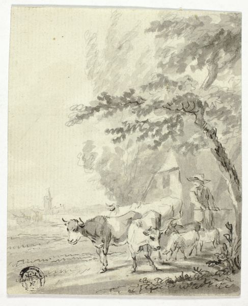 Curator: Look closely at this etching, "Le Rendez-vous à la Colonne," created around 1770 by Anne Philiberte Coulet. It is currently housed in the Statens Museum for Kunst. Editor: It's arresting! The pastoral scene with livestock and a crumbling column feels charged with tension. The body language speaks volumes; a woman in mid-stride carries another in her arms, as onlookers gather. There’s something a little performative about it, a story playing out. Curator: The title translates to "The Rendezvous at the Column," and it speaks directly to the neoclassical era, where historical and mythological themes were repurposed to convey moral lessons or allegorical narratives. This print exemplifies the way such ideas would then circulate and inform public tastes. It’s worth noting that Coulet produced this print after an original painting by Nicolaes Berchem, reflecting a common practice of the time to disseminate paintings more widely via printmaking. Editor: Exactly! Considering that broader context makes the image so interesting to me. Who is having the rendezvous, and why is she being carried? What stories were being told to justify men seated whilst women moved—literally carrying other women! Knowing this was circulated, the power dynamics embedded here raise so many questions around societal expectations, physical labor, and women’s roles. Curator: The classical ruin suggests the weight of history bearing down upon these figures, perhaps symbolizing a world undergoing shifts. Remember, these kinds of bucolic prints often idealised rural life for an urban, often aristocratic audience. There is some indication based on historical accounts, however, that Berchem may have focused on scenes reflecting his travels and direct encounters with pastoral scenes in the southern countryside of Europe. Editor: I can see the artist leaning into that imagined ideal here, a space teeming with narratives begging for deconstruction and unpacking around labor and access. Thinking about whose perspectives and lived realities were and still aren’t often centred is especially pertinent when we consider such historical artworks. Curator: Well said. Ultimately, Coulet’s work provides a valuable opportunity to delve into those social landscapes. Editor: Absolutely. By critically engaging with the artwork, we unveil hidden narratives that continue to resonate in today's dialogues.