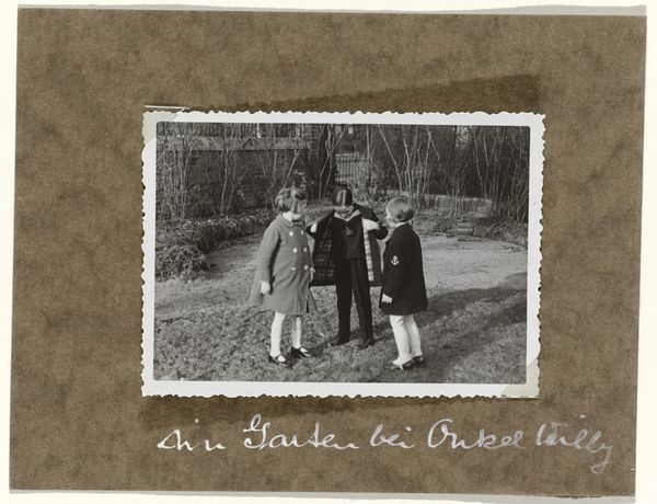 Curator: Here we have "Dicky Baud met twee andere jongens aan de kust," which translates to "Dicky Baud with two other boys on the coast," a gelatin-silver print from around 1930 to 1935. Editor: It’s evocative, isn't it? The subdued tonality sets a melancholic mood despite what I assume was a casual moment captured in this genre painting-esque landscape. Curator: Absolutely. The composition, while simple, adheres to the familiar visual language of genre scenes: the three figures centered against a blurred background of water. The subtle gradations of light and shadow certainly reinforce a strong visual weight that is so very common in landscape photography. Editor: I'm intrigued by the material reality of the print itself. It appears to be mounted within the larger page. One wonders about its status—personal artifact? Archival document? Curator: Its location inside what we see in the background does imply some form of album or personal collection. What is truly important, though, is understanding how Baud has expertly managed depth despite the medium, using it to further establish these three as the definitive focus. Editor: Looking closer, the boys' clothing becomes more telling, each holding the hand of the next. Coats buttoned tightly. Knickerbockers. They almost resemble a small union, bound by custom, class and coast. Gelatin silver requires precision in process and labor, capturing detail yet masking so much, as well. Curator: Perhaps the very ambiguity enhances the viewer's projection onto the photograph? Consider the absence of overt emotional expression— their lack of emotion, their static presentation forces us to consider not only our feelings on that aesthetic, but Baud's skill in being able to evoke emotions of sadness using it. Editor: It makes me think about labor... childhood... a specific Dutch context of the early 20th century... framed, layered, materially situated and full of possibilities in interpretation, from social bonds to processes in construction. Curator: I agree, its material presence and structural choices make it an extremely moving image, capturing an era's nuances. Editor: Precisely. And one deeply embedded in photographic history and in a way, the history of social class within the Netherlands at that time, frozen in gelatin silver.