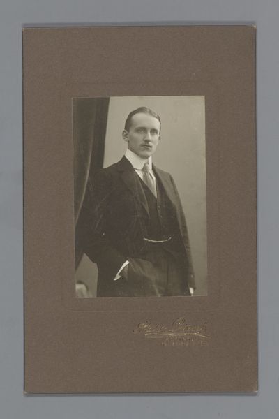 Editor: So, this is a photograph titled "Portret van de heer H. van de Grind," possibly from 1911, by Frits Geveke, using paper as its medium. I'm immediately struck by the formality and a certain wistful air around the subject. What do you see when you look at this portrait? Curator: It whispers stories, doesn't it? This isn't just a photo; it's a time capsule. I imagine Mr. van de Grind carefully choosing his attire, perhaps even practicing his pose. The slightly softened focus evokes a romantic sentiment, quite common for portraits of this era. He exudes quiet confidence, wouldn't you say? Do you feel that's conveyed through his eyes, perhaps, or something else? Editor: It’s definitely there, especially in the slight upturn of his moustache! But also, the meticulous detail—you can almost feel the texture of his jacket. Curator: Precisely! And that’s Geveke's craft shining through. Photography, at this point, was proving its artistic merit, mimicking painting but offering its unique realist angle. But is it truly objective, or does the photographer's hand, his choice of lighting, pose, and even paper, weave its own narrative? Editor: That makes me think about the choices we make even today when taking a simple photo. It's never really just a snapshot, is it? Curator: Never. We curate our realities, even unintentionally. Consider the fading of the paper, the subtle sepia tones that weren't originally intended—time adds its layer to the artwork, enriching it and lending the artwork another emotive quality, wouldn't you agree? Editor: I hadn’t thought of that. I am seeing this now with new eyes, as an experience layered over time, so, thank you. Curator: It is my joy, thank you for these beautiful insights.