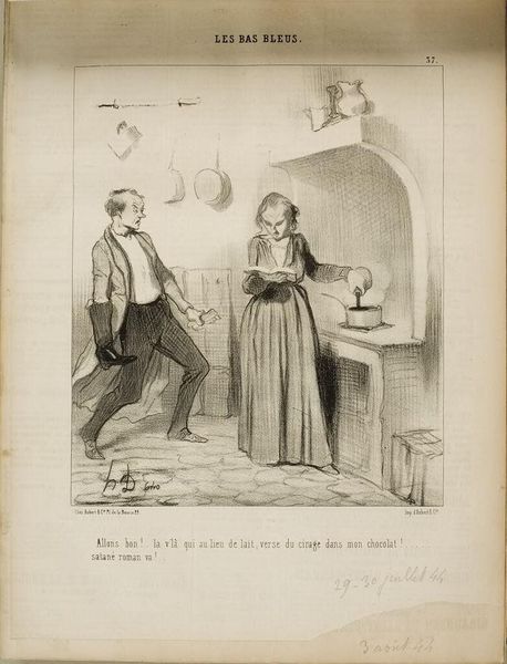 Curator: This lithograph by Honoré Daumier is titled "The Danger of Marrying a Talented Woman," now held at the Harvard Art Museums. Editor: It's striking, really. The stark contrast of the lithographic lines amplifies the almost grotesque expressions of the couple. There is something unsettling here. Curator: Daumier was a master of social commentary. Look closely—her book isn't just an object; it’s a symbol of her perceived transgression against societal expectations for women of that era. Editor: And the way Daumier uses lithography, the greasy crayon on stone, speaks to the grittiness of bourgeois life itself, a critique of the emerging middle class and their anxieties about gender roles. Curator: Exactly. We see the fear of a disruption to the patriarchal order, played out through the exaggerated fear of the husband. What is she reading? What power is she accessing? Editor: Perhaps she is singing. We could interpret the score, the dress, the setting of the curtain and the cabinet, as a stage, where the man is the audience, confronted by her performance. Curator: Daumier really captured the social anxieties, the shifting sands of gender roles. Editor: This piece certainly prompts consideration of how anxieties around art and talent were projected onto women.