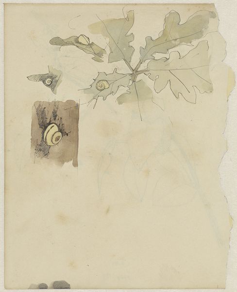 Editor: This drawing from around 1867-68, called "Ornament von Puck und der Elfe" by Paul Konewka, features Puck, a mischievous spirit, rendered in ink. The botanical elements create a delicate, yet slightly thorny aesthetic. What's striking to me is the juxtaposition of this potentially malevolent figure with these very organic shapes, seemingly inviting or enveloping Puck, what do you see? Curator: I see Konewka tapping into a deep well of societal anxieties masked by Victorian-era whimsy. Let's consider Puck, right. This figure isn't just mischievous; it embodies a kind of unruly, anti-establishment energy. The strategic positioning of the elfen figure, faintly sketched on the left, suggests a subtle power dynamic— a kind of watchful presence, maybe representative of a marginalized, perhaps suppressed identity within a patriarchal society. How do the plants themselves, the intertwining vines and thorns, speak to you in relation to this idea? Editor: That makes sense, given the history! Well, the thorny branches and circular formation suggest constraint. Is the elfen figure somehow trapped in oppressive standards? Curator: Precisely. The ornament itself, designed to adorn, can become a symbol of restriction. Think about the Victorian obsession with domesticity and the "angel in the house" ideal. The woman is both pedestalized and imprisoned by such concepts. This is enhanced when we see line-making with sharp attention to detail which confines Puck within the illustration. In this piece, the natural world and supernatural intersect and interrogate social boundaries that bind both. What are your thoughts now? Editor: It completely changes my interpretation! I initially focused on the surface aesthetic, but now I see how Konewka is using seemingly innocent imagery to critique Victorian societal expectations. It also prompts reflections on the elfen form within gender and social hierarchies of the time. Curator: Indeed. By understanding the socio-historical context, the artwork ceases to be a simple illustration and turns into a potent commentary of society itself.