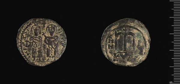 Curator: There's an echo of time in this coin, isn’t there? The "Coin of Herakleios," by Abd-al-Malik, feels almost like a whisper from a long-forgotten marketplace. Editor: It's surprisingly crude, isn’t it? You can almost feel the weight of the hammer strikes, the immediacy of its production. Curator: Absolutely. Imagine the hands that held it, the transactions it facilitated... Money, at its heart, is just a tangible story of human exchange. Editor: Precisely! It's a window into labor practices, trade routes, and material availability. Bronze wasn't just bronze, it was power and access. Curator: And a kind of beauty, wouldn't you say? I sense a certain grace in its decay, a story etched by use and time. Editor: Well, I'm more interested in what that wear and tear tells us about its journey through various economies. Curator: In the end, the coin invites us to consider how something so small can hold such immense historical weight, no? Editor: Exactly. It is a testament to human ingenuity, exploitation, and how materials shape our world.