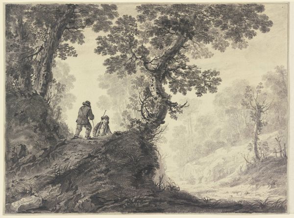 Curator: This drawing, rendered in ink and watercolor on paper, presents "Partie vom Weg über die Eichen unterhalb des Philosophenwegs im Tal bei Kronberg" by Philipp Rumpf. Editor: It feels dreamlike, almost a hazy memory. The muted palette evokes a sense of quietude and stillness within the landscape. Curator: Absolutely. The scene illustrates a pathway through a copse of trees. Dominating the view is a figure with items balanced on her head alongside a smaller figure rendered in comparatively bolder coloring. What elements would you say immediately take prominence within the composition? Editor: For me, it is how the path itself is both linear and circular, giving definition to the movement of these two characters, seemingly within their routines, framed as they are within the imposing tree lines, emphasizing scale. It strikes me as Romantic in its style. How would that style translate to a German audience? Curator: Well, Romanticism certainly sought to find harmony in nature, as does Rumpf here. We could contextualize this with rising industrialization at this time, situating the viewer in the experience of pre-modern quietude away from the noise and pollution in contemporary daily life. You will note that the figures are given prominence over background which gives this piece a narrative quality and illustrates that landscape in its purest form is a tool for staging a moment. Editor: A stage for the ordinary. Perhaps the framing accentuates the connection to the sublime. Those silhouetted trees really give a sense of looming presence, as if nature is watching. What I like, too, is that Rumpf seems to capture that exact point of shadow that indicates a midday or late afternoon time. Curator: A perceptive insight into Rumpf's approach. Note the delicate rendering of light and shadow that creates volume, especially within the characters in the piece. The use of contour to define the landscape creates rhythm and depth, directing the viewer's eye through the artwork, allowing our focus to sit on the more defined areas. Editor: Yes, the interplay of form and light makes it quite evocative. A return to the quiet essence. I find myself wondering if there's any significance in the characters traveling on the "Philosopher's Way," maybe as commentary about the state of the contemporary intelligentsia? Curator: It would be intriguing to research the meaning Rumpf placed within this. Certainly it inspires a thoughtful reading of form and its function within his wider practice. Editor: Agreed. It makes one pause and reconsider the everyday.