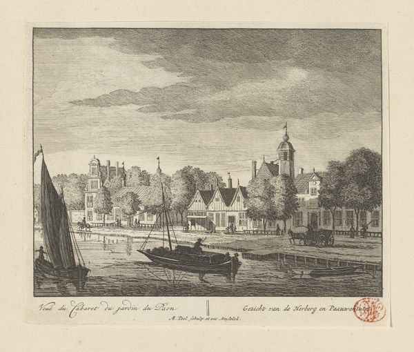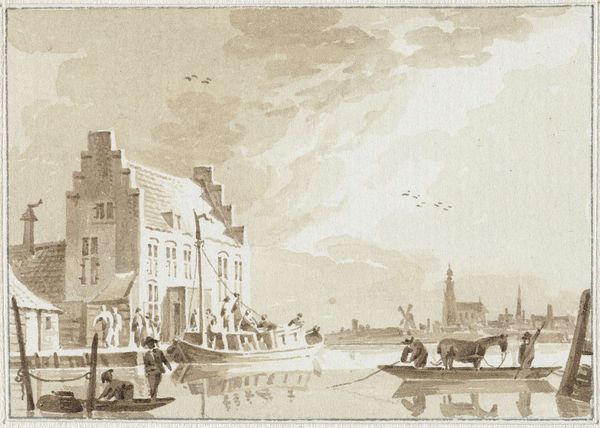 Editor: Here we have Jan de Beijer's "The Old Stock Exchange, Rotterdam," created around 1750. It’s an etching and drawing that presents a captivating view of the cityscape. I'm struck by how the architecture dominates the scene. What elements of visual language stand out to you in this artwork? Curator: The success of this etching lies primarily in the organizational harmony of its spatial composition, in my opinion. Observe how the artist masterfully balances the geometric rigidity of the buildings with the fluid lines of the water and sky. Notice too, how he creates depth. Editor: You're right, I see how the overlapping of elements guides our eyes from the foreground, with the boats and figures, back to the Exchange itself. How does the tonality factor into the overall effect? Curator: Note the limited tonal range, moving mostly in grays, which contributes to the subtle variations in surface and texture that are represented with precision. Consider the interplay of light and shadow across the facades. Ask yourself, does the controlled use of light emphasize form, drawing the viewer's eye to specific architectural details, while contributing to the overall atmosphere of tranquility and order? Editor: It really does create that effect. It's interesting to focus on the technical aspects of the image in order to appreciate the piece more. It helps highlight the intent behind what might appear, at first glance, as a simply representational work. Curator: Precisely. By examining the formal properties, we understand that this is not merely a record of Rotterdam, but a calculated and artful construction. Consider, though, what gets overlooked with a purely formal approach, such as lived experiences? Editor: I guess a more comprehensive approach that combines formalism and cultural context offers a richer appreciation. Thanks for this perspective!