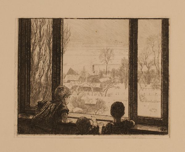 Editor: Henri Fantin-Latour's "Two Ladies Working at an Embroidery Frame" presents such a somber scene. What visual cues create this feeling? Curator: Notice how the window, rather than offering an escape, mirrors the enclosed space of their labor. The very act of embroidery, a traditionally feminine pursuit, is here imbued with a sense of quietude, almost confinement. Does the domestic space feel nurturing or restricting to you? Editor: It's a bit of both, I think. There's a comfort, but also a lack of freedom. Curator: Exactly. The symbolism of the domestic sphere is potent, and Fantin-Latour seems to be questioning its inherent duality. He offers a moment suspended between the comfort and constraint of societal expectations. Editor: I didn't think about it that way before. Thanks for pointing that out.