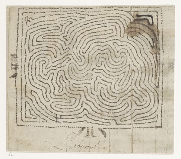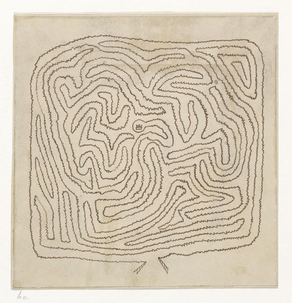 Curator: This artwork, titled "Labyrint," is attributed to Jan Brandes and dates roughly from 1770 to 1808. The medium appears to be a drawing, possibly an engraving or a linocut print. Editor: The texture immediately grabs me. That irregular line, almost vibrating across the page, evokes a feeling of anxious searching, doesn’t it? The off-white color makes it appear aged. Curator: Indeed. It's interesting to consider the historical context. The late 18th century was a period of intense social and political upheaval. One could interpret this labyrinth as a visual metaphor for the complexities and uncertainties of the era. The French Revolution cast a long shadow. Editor: Absolutely. Mazes and labyrinths are potent symbols. They speak to our innate human desire for order and the simultaneous fear of disorientation. The single path leading to the center, often fraught with dead ends, symbolizes a quest, a journey of self-discovery fraught with challenges. This could certainly represent a quest during this turbulent time. Curator: I agree. And note how the labyrinth isn’t perfectly symmetrical. Its irregularities contribute to a sense of unease. Brandes, or whomever created this, likely engaged with the philosophical discourse around the role of reason and chaos within European society, too. Editor: Right. And let’s not forget the religious significance, either. In many cultures, the labyrinth represents a pilgrimage, a spiritual journey. Think of the Chartres Cathedral labyrinth. There is also the sense of hidden knowledge to be divined at its center. Curator: Which leads me to consider the institutional setting in which this image might have been circulated. Was it produced for a wealthy patron or circulated in printed form to a wider audience as commentary? It could be something made as part of a more formal printmaking workshop for distribution across Dutch society? Editor: That’s very true. Even without a defined historical path, this work’s emotional message seems deeply familiar and accessible. What a strange artifact of time that allows us to experience what the original crafter had in mind, the psychological anxiety of exploring new space. Curator: Indeed, it reflects a profound, human concern with order, disorientation, and the search for meaning amidst uncertainty—an image resonant for any period of change. Editor: I agree. Thanks to Brandes’ careful etching and organic shape, we're reminded how ancient and archetypal is that impulse for making visual pathways.