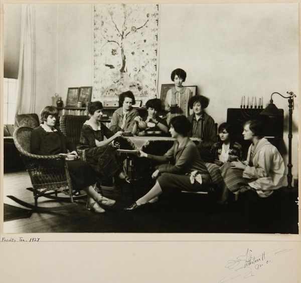 Editor: This black and white photograph is titled "Cheesecake Contest, A & S, Manhasset" by Elaine Mayes. It pictures a room full of women seated behind tables laden with cakes. It has a documentary feel. What can you tell me about this image? Curator: The image speaks volumes about gendered spaces and domestic labor. Note the composition – the women are physically separated from their creations by a barrier, judged on their culinary skills. Does this contest empower or further reinforce societal expectations? Editor: That's a perspective I hadn't considered. It’s interesting to think about it in terms of women's roles. Curator: Exactly. It prompts us to question the politics embedded within seemingly ordinary events, and who has the power to define those roles. Editor: I see it now. Thanks for opening my eyes. Curator: My pleasure. Art invites us to continually re-evaluate these power structures.