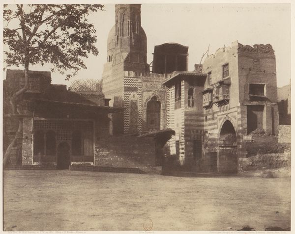 Curator: This stunning sepia photograph, entitled "Street in Fatehpur Sikri, India", was captured between 1858 and 1862 by John Murray, and it resides here at the Metropolitan Museum of Art. Editor: It's immediately evocative. The image carries a profound sense of quietude. Despite the ruined architecture, there’s this incredible stillness and sense of history, even resilience, conveyed. Curator: Absolutely. Murray’s work, like so much of Orientalist photography, invites us to consider the relationship between the British gaze and its colonial subjects. We see Fatehpur Sikri, once a majestic city, presented here in partial ruin. Editor: The partial ruins raise a question: is the decline a matter of factual record, or a symbolic projection onto the colonized space? Consider also who benefits from an understanding that renders certain architectures as ‘historical.’ Curator: And the people are so small! There are these figures nestled within these vast architectural spaces that adds another layer of power dynamics at play here. There's a subtle but crucial dialogue about identity. Are they dwarfed by their own history, or coexisting? Editor: It does echo back to ongoing discussions regarding whose narratives dictate how locations and persons are understood. Think about gender and how its definition informs spaces such as domestic homes as either public or private locations of self-determination. Are the private and public, indigenous lives made visible, or strategically kept hidden? Curator: That's a compelling point. This image, far from being a straightforward depiction of a place, is really enmeshed in layers of social, political, and cultural complexities that need to be critically examined. Editor: Indeed. Looking at this artwork gives so much to reflect on about the intersection of art, politics, and the long shadow of colonialism.