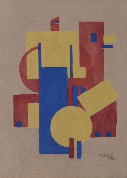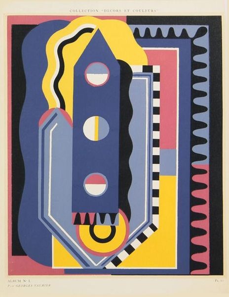 Curator: We’re looking at Thomas Chester Slettehaugh’s print, "Blue Zebras," created in 1954. Editor: What a captivating jumble! The composition almost feels… frantic, doesn’t it? The energetic lines and bold colours practically vibrate off the surface. Curator: Yes, precisely! The interplay of black, red, yellow, and blue presents a vibrant clash. Notice how Slettehaugh manipulates geometric forms – stripes, rectangles, semi-circles - to create both unity and dissonance. He has explored post-impressionist and abstraction. Editor: I can certainly see the abstraction at play here. But given its creation during the mid-century, I am thinking, what cultural sentiments of the period are evoked through this imagery? Was it a reflection on social upheaval or the rigid formalism creeping into urban architecture at the time? Curator: Interesting point. On one level, it could be considered as part of a modernist exploration into non-representational art. The repetitive nature of the striped pattern hints at industrialization and mechanization – the relentless rhythm of modern life. However, it deviates from this with a more relaxed treatment, and an interplay with a range of softer tertiary colours which adds levity. Editor: And that title: "Blue Zebras"—what’s your take on its significance? I’m interested in understanding the intersection of nature and industrial motif, perhaps reflecting post-war environmental concerns? Curator: The title is provocative, of course. The blue of the zebras certainly disrupts our expectations, which invites us to challenge convention. Beyond that, the animal itself could function as a kind of mirror. As striped and patterned creatures that gather as a herd, zebras might even have offered an early warning on the danger to environmental convention from rapid urban development and cultural homogenisation in mid-century society. Editor: It does offer considerable food for thought! This piece manages to capture the spirit of both calculated design and spontaneous creativity. Curator: It certainly does. It makes us see the unexpected and contemplate the role of visual conventions in the creation of meaning and experience. Editor: A delightful and chaotic blend! It underscores how shapes, colours, and themes intertwine to offer not just something aesthetically pleasing but sociologically insightful too.