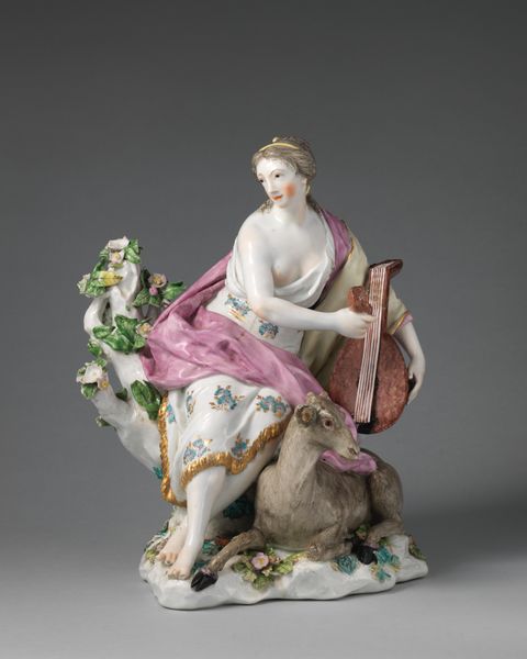 Editor: This captivating porcelain sculpture depicts Venus and Cupid in a Chariot. It's so ornate! What symbolic interpretations can we draw from it? Curator: Notice how Venus holds an apple, a symbol deeply embedded in mythology representing beauty, desire, and temptation, echoing the Judgement of Paris. Do you think Cupid’s presence reinforces this narrative? Editor: I suppose so. It makes me think of the duality of love: its beauty and its potential sting. Curator: Exactly! The chariot itself, adorned with flowers, becomes a vessel not just of physical movement but of emotional transit, carrying these potent symbols through time. What a powerful image! Editor: It really gives a new perspective on how artists use symbols to speak across centuries. Curator: Indeed, a testament to enduring human emotions.