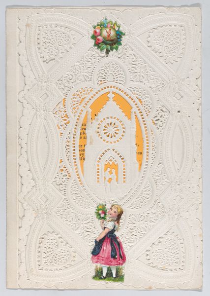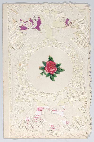 This delicate valentine, made by an anonymous artist, is constructed from layers of paper, meticulously cut and assembled. Rather than traditional fine art materials, it uses the stuff of everyday communication: paper, scissors, and glue. The intricate, lace-like patterns weren't created with thread, but through a labor-intensive process of precise cutting. Notice the way the artist has layered different colored papers to create depth and visual interest. The juxtaposition of the solid white paper with the colored underlays transforms a common material into something precious and visually complex. This type of card speaks to a broader history of handmade expressions of affection, a tradition rooted in skilled handcraft. Each cut and placement reflects not only artistic skill but also countless hours of focused work. Considering this valentine, it challenges our assumptions about art, labor, and value, revealing the artistry embedded in everyday practices.