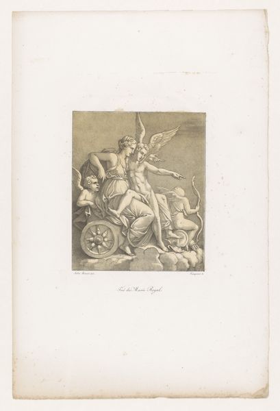 Curator: Let's look at this Baroque engraving titled "Vignet til T. de Hofmans 'Kort Afhandling om Tiende'," created around 1750. What are your first impressions? Editor: My eye is drawn to the almost overwhelming density of forms. It's incredibly intricate and a bit chaotic. There's a tension between the sharp detail of the engraved lines and the overall lack of visual breathing room. Curator: Indeed. It's fascinating to consider the engraving process itself. The artist meticulously cut lines into a metal plate, then used ink to transfer the image. Look at the texture that it creates. The original purpose was to act as a vignette in T. de Hofman's "Kort Afhandling om Tiende" and, as a print, would have been more widely accessible to a burgeoning reading public than, say, an oil painting. Editor: Focusing on its formal structure, I see an interplay between classical statuary on the left and allegorical figures entangled in ornamental foliage, which creates this sense of dynamic instability. What do you think the composition suggests about the function it may have been created for? Curator: Considering the "Tiende" refers to tithing, a form of tax, it's not hard to surmise. Notice the objects within the vignette. There are books, inkwells, scrolls… they evoke knowledge and administration, elements inextricably tied to governance, especially fiscal management in the 18th century. And then the armorial shield right at the top would have functioned as the author's seal. Editor: So, the form is intricately interwoven with its social context. It isn't just a pretty picture, but a crafted object reflecting and participating in the world of economics, governance, and even the labor of printing. It almost romanticizes that administration! Curator: Absolutely. It’s an artifact steeped in the political and material conditions of its production. It speaks volumes about how images, even seemingly decorative ones like vignettes, were integral to the structures of power and systems of knowledge distribution. Editor: Seeing it in this light helps make sense of what initially felt chaotic. Now I perceive how the individual elements come together in that formal way, in this particular print, with that purpose. Thank you.