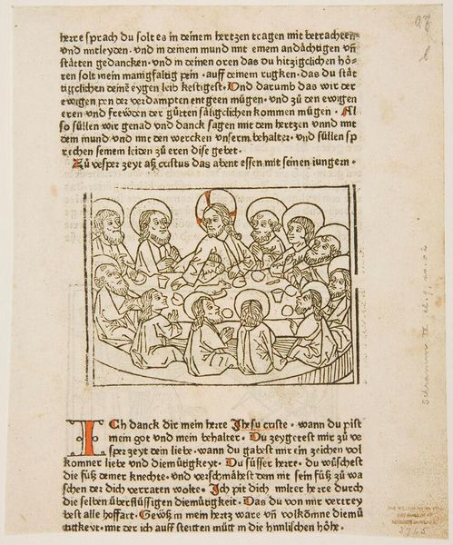 Curator: Look at this fascinating piece, "Figure of Eternal Joy," by an anonymous artist. It resides in the Harvard Art Museums. Editor: The linework is striking, almost stark. The figures seem to be straining upwards towards...what is that above them? It has a very medieval woodcut feel. Curator: Indeed, the style is evocative of that era. It's intriguing how the artist chooses to depict the concept of eternal joy through the arrangement of figures and the celestial being. Editor: The expressions are rather intense for "joy," aren't they? More like awe or supplication. And what of that multi-faced entity overseeing the scene? Curator: Its multiple faces symbolize the all-encompassing nature of God, witnessing from every angle. It reflects the theological perspective of the time. Editor: Interesting, so the artist uses visual cues to communicate religious beliefs. It's more about conveying a message than capturing emotion then. Curator: Precisely. It underscores the public function of art as a tool for religious instruction and social cohesion during that era. Editor: I see how the historical context informs our understanding so deeply here, whereas from a purely formal view, the piece feels more like a structured diagram. Curator: Exactly, and appreciating that contrast adds richness to its interpretation.