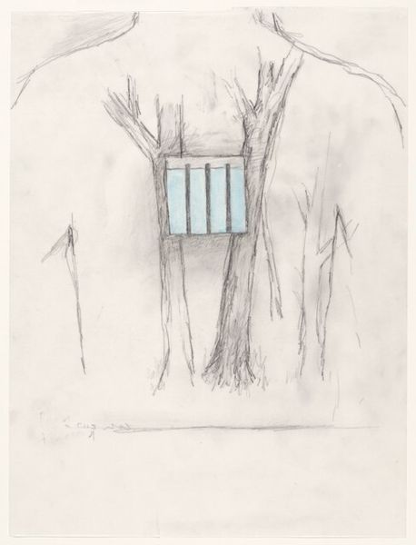 Curator: Here we have Harrie A. Gerritz’s “Een uur op een plek,” created in 1978. It's a watercolor piece currently residing here at the Rijksmuseum. Editor: My initial response is that the layering of the different elements—the pale sky, the shrubs, and that simple gate— evokes a dreamlike, almost unsettling placidity. The sparseness adds to that effect. Curator: That sense of unsettling quiet, I think, speaks to Gerritz’s broader project. This was a period of intense political and social change, particularly regarding land use and environmental concerns. A piece depicting nature but reduced to almost geometric form could be seen as a commentary on humanity’s increasing disconnect from, and control over, the natural world. Editor: Yes, look how Gerritz renders these common pastoral objects as fundamental shapes. That stark, slightly flattened presentation transforms a potentially sentimental landscape into a study of form, line, and space. It flattens our concept of "landscape". I see him playing with modernist ideas. Curator: I agree, and considering the Dutch landscape's fraught history – reclaimed from the sea and meticulously managed – the "hour in a place" may be less about nature itself and more about the complex human relationship to it. He hints at the boundaries we construct to tame our landscapes. Editor: True. The almost clinical depiction prevents the painting from descending into pure nostalgic reverie. He uses clean, unwavering lines to construct the forms, avoiding sentimentality in favor of careful visual analysis. The use of watercolor softens these crisp structural statements just enough, though. Curator: In that way, the medium and the message blend rather powerfully. Watercolor, being traditionally linked to fleeting impressions, almost creates another tension. This could symbolize the way that land and landscapes, once powerful representations of sustenance, tradition and legacy, are so easily molded, shifted and diluted in value. It captures a temporal state, suggesting constant mutability. Editor: A beautiful interpretation, tying those intrinsic aesthetic components to wider socio-political undertones. Seeing this as a commentary is extremely valuable to consider. Curator: Indeed, and recognizing that dynamic between formal structure and the artwork's broader societal narrative enriches our engagement with Gerrit's piece considerably. Editor: A powerful point to conclude with. A painting with what looks like simple forms creates an opportunity to dive into the way people relate with their ever changing, transforming lands.