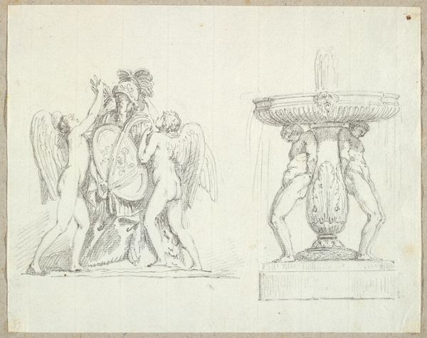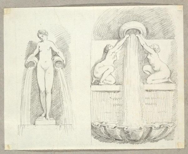 Curator: This delicate graphite drawing is titled "Two Studies for Fountains with Two Nude Women Holding a Water Jar" by Jean-Honoré Fragonard. The Harvard Art Museums hold this sketch, measuring about 18 by 23 centimeters. Editor: It's quite striking! The figures seem to emerge from the page, almost dreamlike. There’s a softness to the rendering that belies the monumentality of the intended fountains. Curator: Fragonard, active in 18th-century France, was known for his playful and often erotic paintings. These fountain studies, though preparatory, reflect the period's fascination with classical ideals and the female form as an allegorical figure. Editor: It's interesting how the water jar, held aloft by these women, becomes a focal point. Water, often associated with purity and life, is here mediated through the female body, reinforcing gendered power dynamics. Curator: Indeed. The sketch offers insights into the artistic process of designing public monuments during that era, showing how classical ideals were reinterpreted and presented to the public. Editor: Yes, and reflecting on today’s perspective, it invites us to critically examine how these historical representations continue to inform our perceptions of gender and public art. Curator: A valuable point—it reminds us that even preliminary sketches can hold layers of social and cultural meaning. Editor: Absolutely, seeing Fragonard’s ideas allows us to look critically at the role of women in art through the ages.