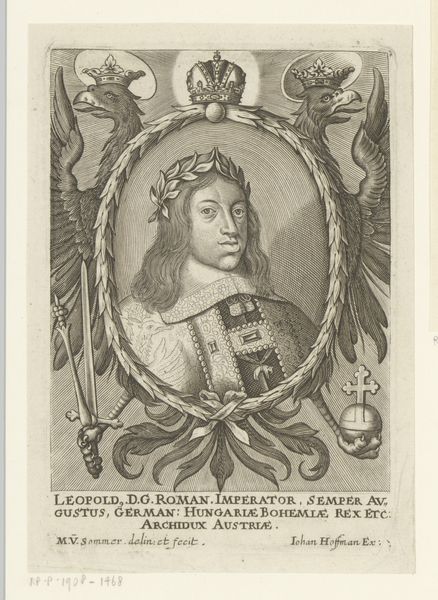 This is a portrait of Leopold I, rendered in print by Pieter de Jode II. Immediately, the tight, circular framing draws our attention to the subject's face, yet it is quickly diverted by the surrounding iconography. We see an eagle, a laurel wreath, and various symbols of imperial power. These elements are not merely decorative; they actively construct and reinforce Leopold's identity as a ruler. Jode’s engraving technique, with its dense network of fine lines, creates texture and depth. Note how light and shadow play across Leopold’s face and robes, lending a sense of volume and presence. Consider how the artist organizes these visual elements. The composition isn't just about representation but about the structured presentation of power, signaling the symbolic weight of the emperor's image and suggesting a highly codified system of signs and meanings.