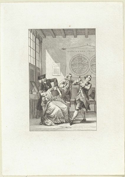 This etching, made by Reinier Vinkeles, presents a snapshot of 18th-century life, focusing on the moment a man receives a letter. The composition draws you into the heart of the scene with linear precision and tonal contrast. Notice the spatial arrangement: the figures are meticulously placed, creating depth through overlapping forms. Vinkeles uses a fine network of lines to define shapes, model light and shadow, and articulate textures from the clothing to the interior setting. The figures form a dynamic tableau, yet each is rendered with a clarity that suggests a deeper narrative, perhaps of social exchanges and personal fortunes. The act of receiving the letter becomes a focal point, charged with unspoken implications. Consider how such a seemingly simple exchange is elevated through Vinkeles's careful attention to line and form, transforming an everyday event into a significant moment frozen in time.
