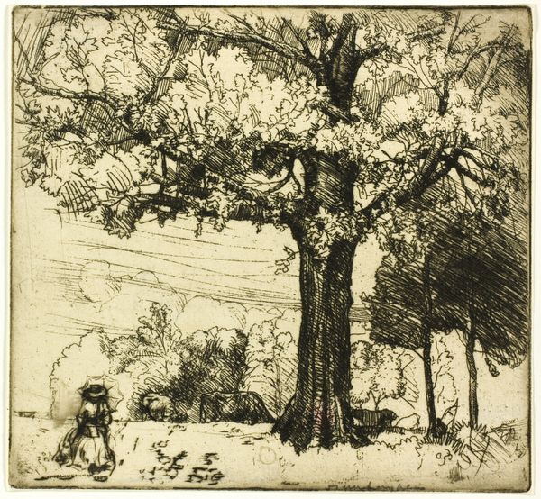 Curator: Let’s turn our attention to *Cork Trees Near Mimizan*, an oil on canvas believed to be the work of Winston Churchill. The painting captures a sun-drenched avenue of cork trees. Editor: It strikes me as quite dense; a bit overwhelming with its impasto and strong directional brushstrokes. There is no smooth blending here at all! Is this an amateur landscape or a deliberate artistic approach? Curator: Perhaps both! Churchill was, after all, largely self-taught. Notice the reddish-brown trunks – they seem to stand like silent witnesses, imbued with a deep-rooted, almost ancestral presence, echoing ancient forests of mythology. Editor: The reddish trunks certainly stand out! You’ve got these assertive vertical masses anchored at different intervals across the visual field, and they strongly counter the horizontal recession of the path, which, notably, pulls the eye to an indistinguishable background space. This interplay creates significant visual tension. Curator: It also offers us, metaphorically, a sense of time. Trees are the age-old guardians standing for something solid, but in stark contrast, people on the path disappear and are ever changing. Editor: You read this symbolism into what I view more practically, I suspect. The two human figures are almost not there. The impressionist style allows Churchill to focus less on realistic and meticulous details, with much focus on the trees! What do the people stand for? Perhaps just objects? Curator: I read the man standing as rooted and stable; in conjunction with the second figure seated and contemplative. This may relate to the artist as actor within his environment, perhaps contemplating leadership and rest in equal measure? It’s also the light; It is hitting a few certain spots as he wanted it. Editor: It’s interesting how the light and color play off each other, animating the foliage in broken, vibrating brushstrokes, but also serving to flatten out forms and compress depth simultaneously. Churchill favors more block-like paint application than some of his contemporaries. Curator: I agree with your observation, there's a sense of rawness and immediacy. Thank you for noticing those things. Editor: Ultimately, it feels less concerned with mimicking objective reality than it is with rendering the subjective experience of perceiving it.