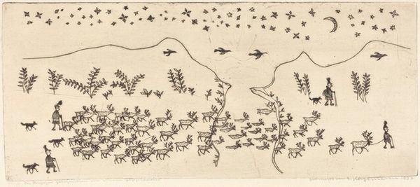 Roger Vieillard created this print, Homage to Rimbaud, as a dedication to the 19th-century French poet Arthur Rimbaud. Rimbaud, known for his symbolist poetry and transient lifestyle, often explored themes of rebellion, freedom, and the search for ecstatic experience. Vieillard conjures Rimbaud’s spirit through a celestial dance above a landscape secured by chains of stars. Note the handwritten verse beneath the image, a quote from Rimbaud which translates to, "I stretched ropes from steeple to steeple; garlands from window to window; golden chains from star to star, and I dance." The chains, seemingly binding the city to the heavens, suggest a tension between earthly constraints and a yearning for transcendence. Vieillard, like Rimbaud, invites us to consider the artist’s role in challenging societal norms, and shaping alternative narratives through their work. This piece becomes an intimate reflection on how individual expression intertwines with collective aspirations for freedom and connection.