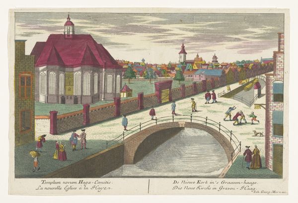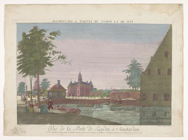 This print, *Gezicht op de Muiderpoort te Amsterdam*, was made by the Kaiserlich Franziskische Akademie. It’s an etching, a printmaking technique where lines are incised into a metal plate with acid, then filled with ink and printed onto paper. The coloring was added later. The material qualities of the print speak to its creation. Look closely, and you'll see the fine lines created by the etching process, which give the image its crisp detail. The texture of the paper itself adds a tactile dimension to the print, inviting us to consider the physical object. The print was likely made in multiple impressions, a testament to the rise of mass production and dissemination of images. The Academy was producing works for consumption by a growing middle class with a desire for images of city life. The etching process, involving skilled labor, reflects the social context of workshops and commercial production, tied to wider issues of labor and consumption. So, considering materials, making, and context is crucial for understanding the full meaning of this print.