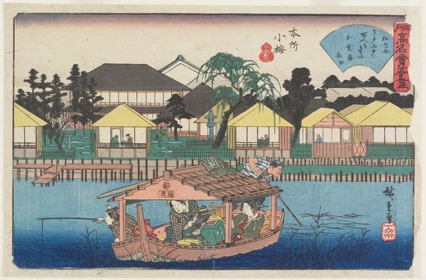 Editor: Here we have Utagawa Hiroshige's woodblock print, "Restaurant Kawachiya in Yanagibashi, Ryogoku," made sometime between 1835 and 1840. It’s incredibly evocative; the composition feels both intimate and expansive, with the restaurant scene in the foreground giving way to the bustling river beyond. How do you interpret the symbolism within this print? Curator: It’s fascinating how Hiroshige layers the human experience against the backdrop of nature and commerce. Notice the figures: some are absorbed in their meals or perhaps literary pursuits, while others actively observe the river traffic. What might these visual juxtapositions tell us about Edo society’s relationship to leisure and labor? The river itself, alive with boats, acts as a potent symbol. Editor: Are you suggesting that the boats and travelers point to ideas about connection? Curator: Precisely. In Japanese iconography, water often represents a journey—not only a physical voyage but a metaphor for life's path. The sails could symbolize aspirations and forward movement, while the bridges and structures represent the human effort to traverse and connect. Note too, the carefully chosen placement of text in fan and cartouche shapes to convey complex details. How might all this symbolic language reflect the cultural values of the time? Editor: I guess it speaks to a society in motion, valuing both reflection and active engagement with the world. I hadn’t considered how each element contributes to this narrative. Curator: Indeed. Consider how even the smallest details, like the arrangement of dishes, speak volumes about the era's cultural norms and aesthetic preferences. It underscores the powerful way images become repositories of memory and meaning. Editor: This has totally changed how I see this artwork; the layers of symbolism add a whole new dimension. Curator: Visual symbols carry deep emotional, cultural, and psychological weight.