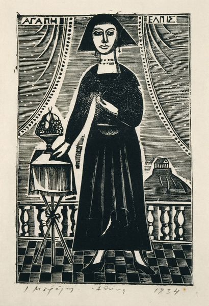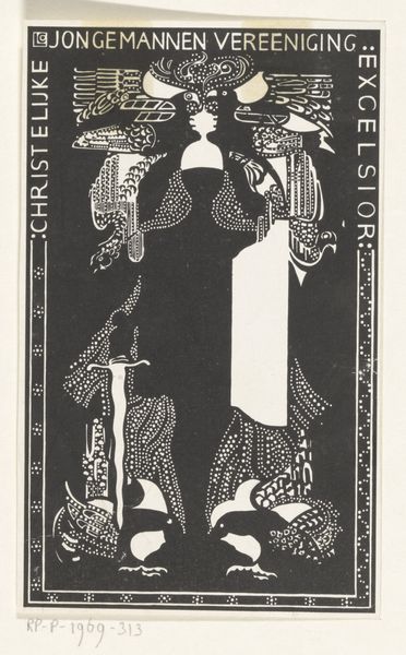 This is "De Muziek", a black and white woodcut, by Samuel Jessurun de Mesquita. Its contrasting tones and simplified shapes immediately draw the eye. The composition centres on a figure in a long, light robe. It appears to be a singer, as indicated by their open mouth and expressive hand gestures. Behind them, we see a stylized organ with a series of vertical lines and curved forms, creating a visual rhythm that echoes the musical theme. The stark contrast between light and shadow flattens the space, emphasizing the graphic quality of the print. Mesquita's use of bold lines and contrasting shapes to depict form and space can be considered in relation to a structuralist analysis where the binary opposition of black and white functions as a fundamental system. This visual strategy simplifies the forms to their essential elements, allowing for a potent expression. Notice the artist's skill in using the medium's inherent qualities to create a visually striking and emotionally evocative work. This interplay between form and content is a testament to art's capacity for ongoing interpretation and meaning.
