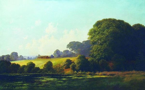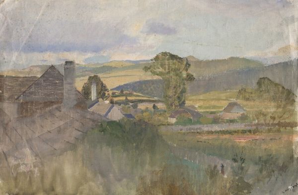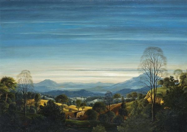 Curator: This is Douglas Percy Bliss’s "Gunhills, Windley," currently held in the Tate Collections. Editor: It’s immediately striking how the manicured garden gives way to the wilder landscape. The contrast in textures is compelling. Curator: Indeed. Bliss, emerging from the interwar period, engaged with notions of pastoral ideal and rural escape popular at the time, reflecting a longing for simpler times amidst social upheaval. Editor: The painting's made from oil on canvas. The way Bliss builds up layers of paint gives the foliage such a dense, almost tangible presence. Curator: The garden itself, and the labour to maintain it, speaks to class structures. Notice how the figures almost blend into the shadows, perhaps hinting at their role within this idyllic setting. Editor: The materiality of the landscape, represented in paint, becomes another commodity itself, doesn't it? Another thing to be owned and consumed. Curator: An interesting counterpoint! It really does give us pause to consider the different layers of societal and material influence at play here.