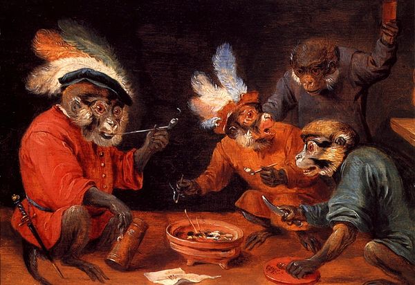 William Holbrook Beard created this unnamed oil on canvas, now known as "Domestic Squabble," which depicts a scene of conflict and chaos. The painting is dominated by the struggle between a monkey and a cat, set against a backdrop of disarray: broken pottery and scattered fruit litter the foreground. Beard uses sharp contrasts in light and shadow to heighten the drama of the scene, accentuating the animals' expressions of fury and surprise. The monkey, positioned on the left, has a posture of alarm, its mouth open in a possible yell. Below and to the right, the cat is upside down, also with its mouth open in a yell. This use of figuration prompts the viewer to question the symbolic relations between animals and humans and what these might mean in the context of domesticity. Ultimately, "Domestic Squabble" isn't just a simple scene; it questions the traditional roles assigned within domestic life, using animal figures to destabilize expectations.