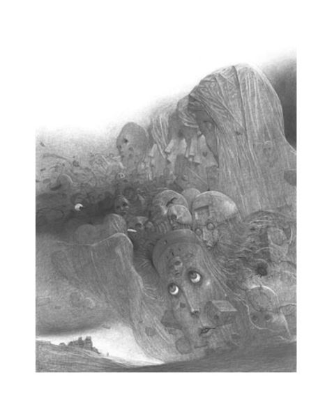 Here, we see an undated, untitled drawing by Zdzislaw Beksinski, made with graphite on paper. The drawing is dominated by a complex, almost surreal composition featuring a face-like structure suspended above a barren landscape. The face itself is not a simple representation, but rather an architectural form populated with figures and symbols reminiscent of death and decay. The texture is achieved through meticulous crosshatching, building up dark tones that suggest depth and decay. Beksinski uses the medium to evoke a dreamscape or a nightmarish vision. The use of grayscale emphasizes the contrast between light and shadow, adding to the overall sense of foreboding. The dreamlike quality of the drawing challenges the viewer to interpret the symbols. The composition destabilizes fixed meanings, reflecting the artist's exploration of existential themes. The meticulous detail and stark tonal contrasts invite us to contemplate the nature of reality, memory, and the darker aspects of human existence, making it a powerful statement on the human condition.