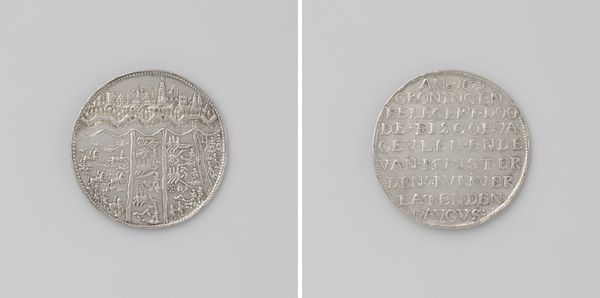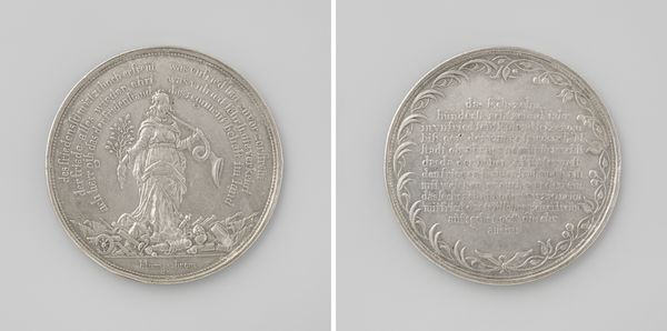 Editor: Here we have "Zeeslag bij Gibraltar en het sneuvelen van admiraal van Heemskerck," or "The Battle of Gibraltar and the death of Admiral van Heemskerck," created in 1607 by Gerard van Bylaer. It appears to be an engraving on metal, possibly a coin or medal. It feels quite formal, with the very precise and densely packed text on one side. What do you see when you look at this piece? Curator: The sheer density of imagery and text on such a small object is significant. On the pictorial side, despite the small scale, a fierce naval battle rages. This isn't just a record of an event; it’s an attempt to immortalize Admiral van Heemskerck. The reverse side, filled with Latin text, reinforces this memorial aspect. Think about the symbolism inherent in maritime battles—control, power, trade routes. What feelings might that have inspired in people at the time? Editor: I can imagine that victorious imagery like this was very important for a nation’s self-image, or how the Dutch wanted to be seen. Does the battle itself have particular significance that's echoed here? Curator: Precisely. The Battle of Gibraltar was a major Dutch victory against the Spanish. Victory was often associated with divine favor and national pride. The engraving served as propaganda but also tapped into deeply held cultural beliefs about courage and leadership. Consider how the depiction of Admiral van Heemskerck transforms him into a symbolic hero. Editor: So the object acts as a lasting memento and a celebration of collective identity. Thank you. That's really deepened my understanding. Curator: Indeed. These seemingly small objects encapsulate so much of the historical, cultural, and personal meanings of the era.
