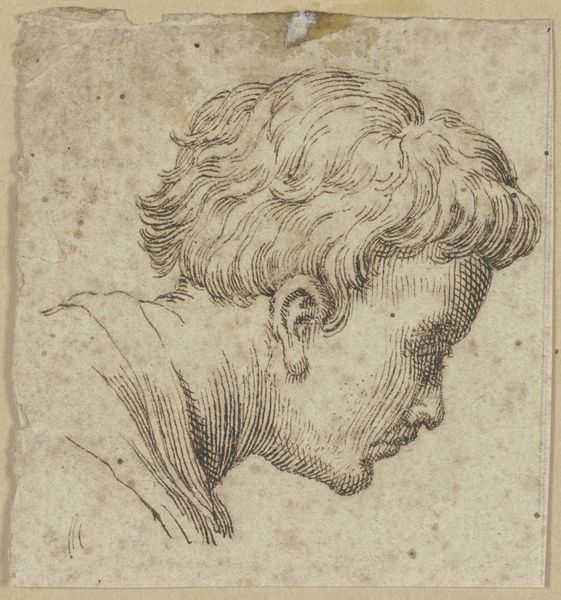 Editor: Right, let's talk about this intriguing drawing: "Studie nach dem Kopf von Michelangelos _Giuliano de' Medici_" created around 1526-1534 by Baccio Bandinelli. It's currently housed in the Städel Museum, done with ink on paper. My first impression is how the artist built form with so much consistent hatching - it seems incredibly methodical, yet the expression feels somewhat… vacant. What do you see in this piece, especially given that it is a copy after another artwork? Curator: Ah, a copy, yet not merely a copy. Imagine Bandinelli, pen in hand, wrestling with Michelangelo's genius. He's not just reproducing; he's internalizing, perhaps even challenging. I see this incredible, almost obsessive, layering of lines as a kind of meditation. It reminds me of how a writer might repeat a phrase to understand its rhythm and meaning. The 'vacant' expression, as you say, perhaps that's the point. Maybe it’s about the Platonic ideal, beyond earthly emotion. Does the geometric quality strike you as significant in achieving this effect? Editor: I see what you mean about challenging genius. The hatching flattens the face, doesn’t it? There are only slight variations in tone. It’s less emotionally engaging, more intellectual. The rigid crosshatching pattern contrasts sharply with the naturalistic rendering of the face, almost as if Bandinelli is imposing order. Curator: Precisely! The High Renaissance sought harmony between the ideal and the real. This drawing, in its very controlled, almost graphic quality, emphasizes that pursuit of order, the artist’s intellectual grasp. Don't you think this controlled geometric hatching style provides it with its own individual presence and voice? What Bandinelli learned from the experience is ultimately ineffable. Editor: Yes, I now have a different impression of Bandinelli’s technique. Initially I viewed this mechanical-like rendering as almost dull, but thinking of it as him ‘grappling’ with a predecessor for some form of resolution offers me a renewed, elevated appreciation of the creative exercise as a learning process. Curator: Exactly! It’s not just imitation, it’s an encounter. And every encounter, in art as in life, transforms both parties, however subtly.