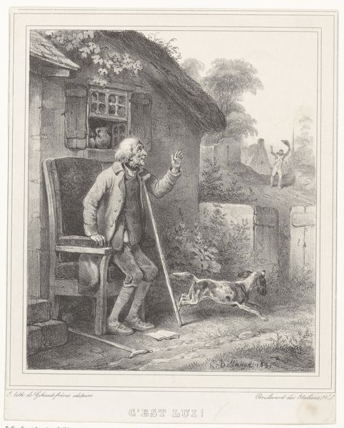 Editor: Here we have "Man Talking to a Woman Winding Yarn," an etching by Adriaen van Ostade, from 1684. I'm immediately struck by the detail achieved in such a small print. It almost feels like I’m peering into a realistic little world, despite being created only with lines. What catches your eye about the composition and technique? Curator: Note how Ostade uses varying densities of etched lines. Observe where they are most dense and where they thin to create areas of highlight. How do these varying lines contribute to your perception of form? Editor: I see that! The densest lines define the shadows under the porch roof, inside the doorway, and around the figures, making them stand out from the lighter background. The effect gives the print depth. It feels very textured, even though it’s just lines on paper. What else is remarkable in the relationship between technique and form? Curator: Yes, examine also the hatching and cross-hatching in the rendering of the architecture. Note how such meticulous placement gives form to each building component: The lines denote where the eye perceives surface texture as it rounds into shape. Editor: The different textures and shapes create an almost palpable sense of the scene. The windows, the stone wall, the woman's clothing—each seems distinct due to the careful control of the etching. Curator: Precisely. The artist draws the eye, invites the observer, to interpret this tableau though their consideration of shape and light play. What do you suppose the absence of color adds to the piece? Editor: That’s interesting, without color, our attention really is directed to line, form and texture! It invites us to look very carefully at how the etching process is working to convey the story. Thanks so much.
