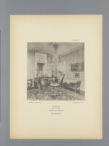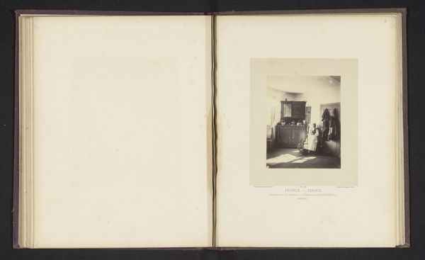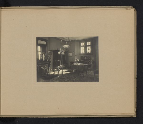 Editor: So, here we have "Interieur met een bureau," or "Interior with a desk," a photographic print by Christiaan Johan Neeb, created before 1897. There's something very still and posed about it. The desk and chair are carefully arranged. What strikes you about this image? Curator: Immediately, I’m drawn to the textures and how they speak to social class. Notice the patterned wallpaper – mass-produced, most likely. And then the desk itself: its manufacture suggests industrial processes democratizing access to furniture previously reserved for the elite. How does Neeb's choice of photography as a medium fit into this exploration? Editor: That's interesting. Photography made image-making accessible, but it was still a specific *kind* of access. It wasn't as ubiquitous as it is today. Curator: Exactly! The print itself is a manufactured object. Think about the chemicals used, the paper produced in mills, the labour involved in every step. Even this ‘realistic’ depiction is a product of very specific materials and production methods shaped by the society in which Neeb operated. Editor: So, looking at the *means* by which this image came into being reveals its meaning and broader context? Curator: Precisely. And don't forget the context of display! This photograph exists as a print in a book. What does it tell us about the culture of image consumption and knowledge dissemination at the time? Was this a luxury item or something intended for a wider audience? Editor: I see now that looking at materials and modes of production changes the entire reading of what seems, at first, like a simple interior shot. Thanks! Curator: Absolutely. Art history isn't just about aesthetics or the artist’s intentions. Examining the *making* of art reveals a whole network of social and economic forces at play.