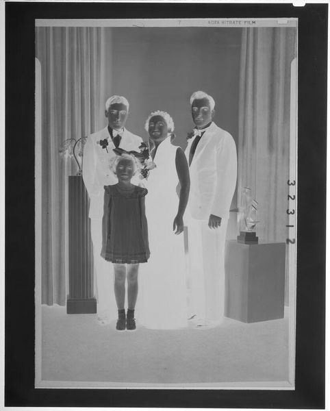 Editor: This untitled photograph from Lainson Studios shows a family portrait in what looks like a mid-century living room. There's even a dog! Given the formality, what can we say about the cultural function of portraiture here? Curator: Well, the photograph encapsulates the ideal of the nuclear family, a powerful social construct, especially prevalent in postwar America. The crisp attire, the well-appointed home, and even the family dog, project an image of stability and success. Editor: So, it's about projecting an image, not necessarily reflecting reality? Curator: Precisely! Photography, especially in this context, becomes a tool for constructing and disseminating specific cultural narratives and aspirations. Note how the family dog grounds them to the space. Editor: That makes me look at the image in a completely different light. Thanks! Curator: My pleasure. It shows how cultural norms can shape even seemingly simple family photos.