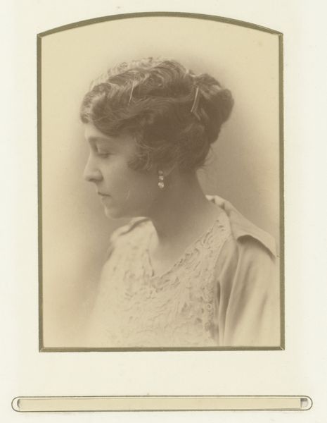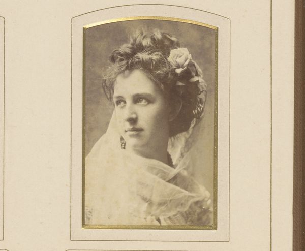 Curator: This gelatin-silver print, "Portret van een vrouw, aangeduid als Mme. Martin," dates to sometime between 1870 and 1900. It captures the sitter in profile. Editor: There's a melancholic air to it, a kind of fading beauty. The oval frame gives it such a sense of containment. Almost like a pressed flower in an album. Curator: It's intriguing how portraiture shifted with the rise of photography. Before, painted portraits were the domain of the wealthy, but now photography offered a wider audience access to memorializing themselves. What kind of statement do you think a portrait like this made in its time? Editor: It signaled belonging, didn't it? To have your likeness rendered, even photographically, suggested a degree of social standing, permanence, and family connection. But consider her gaze; it isn't assertive or challenging, more like quietly observing, passively receiving attention. The locket she's wearing is a lovely personal detail. Curator: Lockests were popular for holding portraits, so her necklace is effectively containing another layer of representation, maybe family, maybe a loved one passed. Note, also, the limited tonal range in the print; that adds to the romantic and slightly sentimental atmosphere. It would resonate with then-current ideals about feminine beauty and sentimentality. Editor: Sentimental, yes, and maybe that was intentional. The pictorialist aesthetic aimed to elevate photography to the level of art by imbuing it with painterly qualities. That softness almost masks the realism photography is known for. Curator: And the softness lends it this otherworldly feel, right? Which only serves to emphasize her idealized beauty. But it also raises a point on authenticity. It's photography, yes, but how much of "Mme. Martin" are we actually seeing here? Or are we presented with a fiction carefully constructed and preserved. Editor: Ultimately, it speaks volumes about how individuals wished to be seen and remembered. It also shows us how much we need images to locate people across the time, whether as a keepsake of identity, a political prop, or just something nostalgic that triggers an unnamable sense of memory. Curator: Very well observed. It reminds us that cultural memory resides in these traces that continue to evoke ideas about presence and absence in ways we hadn’t perhaps considered before.