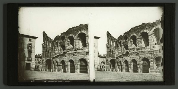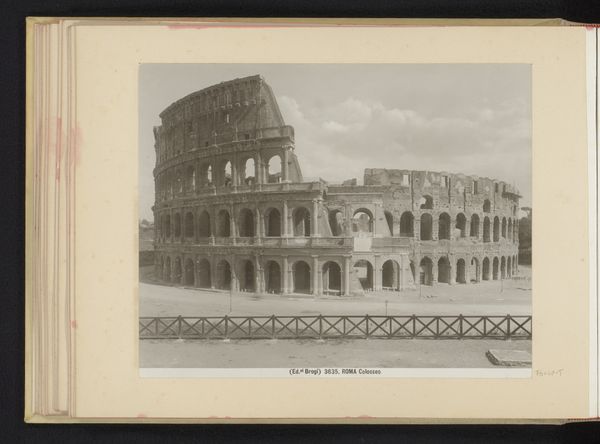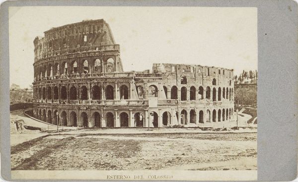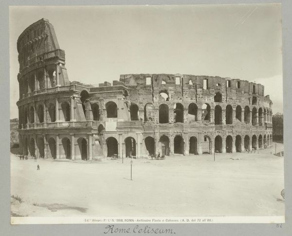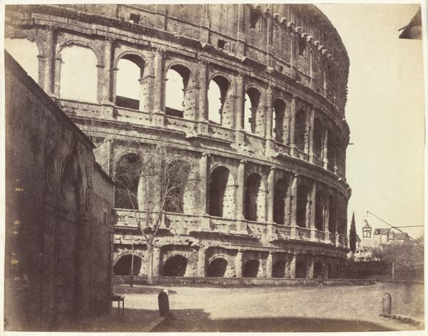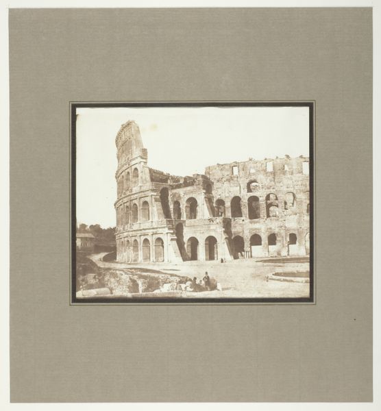 Curator: Looking at this gelatin-silver print, “Colosseum te Rome” by Calvert Richard Jones, created around 1846, one is immediately struck by its texture. The monochrome medium seems to highlight the Colosseum’s grand but ruinous form. Editor: Absolutely, there's a powerful contrast between the sharp architectural details and the soft, almost dreamlike quality of the light. The photographic technology of the time lends an air of romantic decay. It whispers of temporal inevitability. Curator: And consider what the Colosseum represents—not merely ancient architecture, but the power, spectacle, and, ultimately, the fall of the Roman Empire. The shadows cast by the structure seem like specters of the past, constantly looming. There's a palpable sense of history layered upon history. Editor: The composition is also really smart; notice how Jones uses the foreground space to frame the structure. Those little figures at the base—a few humans placed on the ground plane, as if to say "Look upon my works"—become a subtle visual key; not simply scale, but human experience. Curator: Those figures provide a crucial anchor, don't they? They underscore the human element dwarfed by history's enormity. In its time, this image presented a vision of classical inheritance being experienced—personified—by moderns. Today, they make a viewer reckon with one's own fleeting place within history’s unfolding narrative. Editor: Indeed, the artist presents time and its impacts, formally and emotionally. Consider, the rough materiality of the crumbling stone rendered by the chemical sensitivity of early photography, as though we are seeing with both present vision and an archaeologist’s memory simultaneously. Curator: And in this sense the work provides not merely an image but evidence. Editor: True enough. It’s fascinating how it uses a cutting-edge technology to capture a ruin and meditate on time, power, and perception.