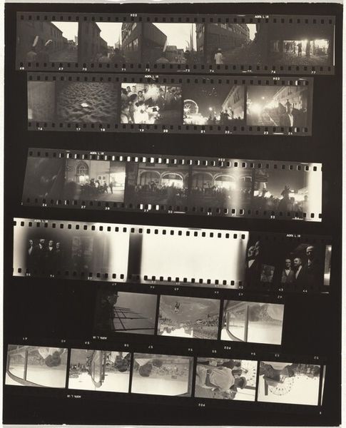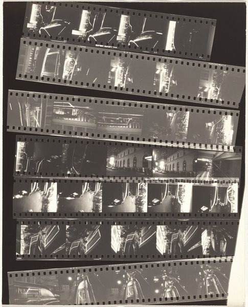 Editor: Here we have Robert Frank's "Subway no number," created in 1955, a gelatin silver print, almost like a photographic storyboard. Looking at these rows of images… it feels like a voyeuristic glimpse into a bygone era, a very intimate moment. What catches your eye most in this piece? Curator: You know, I see a beautiful dance between the public and the intensely private. Frank has this uncanny ability, almost like a shadow, to capture fleeting moments of raw humanity. Each frame feels like a whispered secret, wouldn't you agree? And those contrasts! The harsh blacks and piercing whites aren't just aesthetic choices, but emotionally resonant… What does it stir in you? Editor: I feel this tension between the candid and the composed. I also see narratives begin to form… or is that my imagination running wild? Curator: Darling, isn’t that the deliciousness of it all? Art mirroring life, life reflecting art. Each of us brings our own narrative, our own experiences to interpret it. Look closely at the sequencing. Do you see a narrative that jumps out? Editor: Now that you mention it… Perhaps the movement from external to internal spaces. I see some scenes on the train and maybe apartments or homes as the film strip moves down. Thanks for pointing that out. Curator: Art unfolds itself to those willing to look beyond the surface, wouldn’t you say? It is more about what the art does *to* you, right? Editor: Absolutely. I will carry a new curiosity next time.