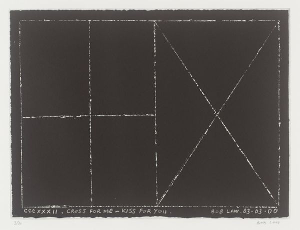 Curator: Bob Law's "A Cross to Bare," is an evocative minimalist image. It seems incredibly stark at first glance. Editor: Yes! Immediately I get the impression of something looming, almost oppressive. Like a void bisected. Curator: Law, born in 1934, created this in 2000. The simple cross shape, universally laden with meaning...it's deliberately provocative, isn't it? Editor: Absolutely. It plays on that primal, almost instinctive response to seeing a cross – whether you’re religious or not. But then it’s stripped back, raw. Curator: The title suggests a burden, the idea of carrying something heavy. Do you think Law is hinting at personal or collective suffering? Editor: Both, maybe? The beauty of minimalism is its openness. It’s a mirror, reflecting the viewer's own baggage, their own interpretation of that cross. Curator: A powerful image, stripped to its essence. Editor: It makes one reflect on how much meaning and emotion can be packed into a few simple lines.