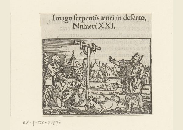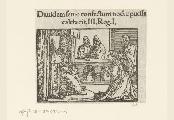 Curator: Welcome. Before us is a 16th-century print entitled "Salomo zittend op zijn troon ontvangt een boodschapper van koning Hiram," dating roughly between 1530 and 1533. Its creator is currently listed as Anonymous. What strikes you first about it? Editor: The stark linearity. Everything is delineated with these crisp, decisive lines. It conveys a mood of pious seriousness, a kind of austere nobility. It feels...hieratic. Curator: Indeed. Note the use of line in creating texture and volume. The artist uses hatching and cross-hatching techniques typical of engraving to suggest the fall of light on the figures' robes and the throne itself. Look how the lines on the floor converge to create a sense of perspective, guiding our eye towards the regal figure of Solomon. Editor: Yet, the scene is more than a formal exercise. We witness a critical interaction. The print illustrates the power dynamics inherent in knowledge exchange and governance. Consider the subservient posture of the messenger versus the regal immobility of Solomon. Who holds the power to interpret, to decide, to build? Curator: A vital observation! Solomon, seated, embodies wisdom and authority. The messenger’s gift can be read formally as introducing another level of visual depth, adding to the picture plane, and also, thematically, expanding the network of relationships critical to Solomon's rule and prosperity. Hiram offering Cedar wood, lumber that becomes sacred, transformed for Solomon’s “domus”, building both literal and metaphorical architectures of influence. Editor: I agree, and let's acknowledge the limited scope, and the limits of our gaze. Considering contemporary ideas of diplomacy and power, how can an artifact like this engraving inform our view of modern politics of globalization? Are such relationships ever truly reciprocal, or is the shadow of colonialism and economic exploitation an eternal fixture in how powerful people sit in relationship to the labor and knowledge of those positioned in supplication? Curator: A fitting challenge. This engraving shows skillful visual choices creating an impression that endures centuries. Editor: An important glimpse, even while we look both at and beyond this moment.