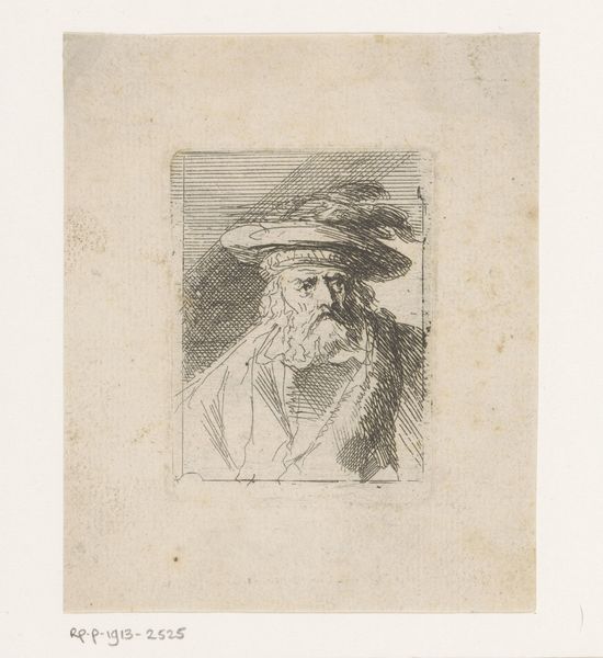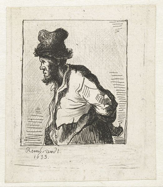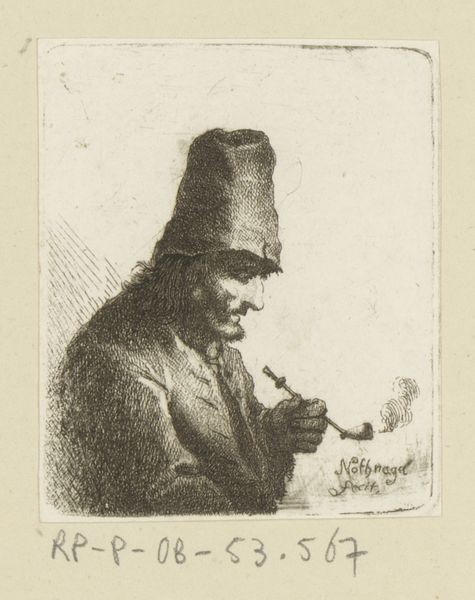 This etching, made by Johann Andreas Benjamin Nothnagel, presents a man in stark profile, dominated by the visual weight of his high hat. The artist's linear approach and the monochromatic palette evoke a sense of texture. The composition's strength lies in its dynamic contrast between the densely worked lines that define the figure and the comparatively empty space that surrounds him. The use of hatching creates depth and volume, particularly evident in the man's hat and the folds of his clothing. Nothnagel masterfully uses line to suggest both form and shadow, giving the figure a tangible presence despite the etching's diminutive size. Ultimately, the etching invites us to consider how simple means can convey complex character, reminding us that art’s power resides in its formal elements as much as its subject matter. This piece remains an open text, awaiting our interpretation.