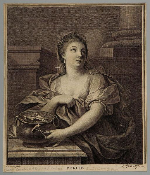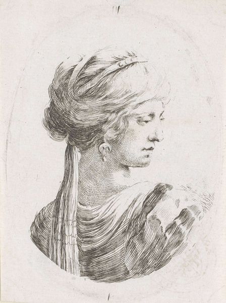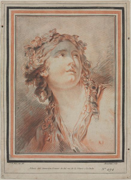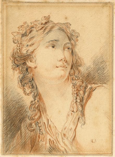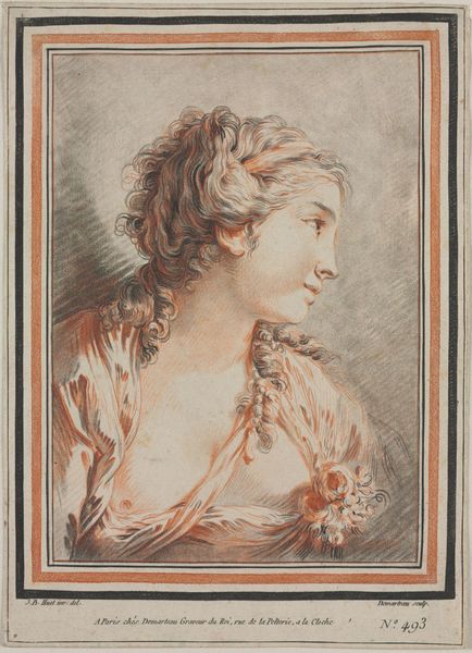 Editor: So, this is "Buste van vrouw," a drawing on paper by Gilles Demarteau, created sometime between 1732 and 1776. The lines are so delicate, and the pose feels very considered, very graceful. What historical perspectives can you offer on this particular piece? Curator: This drawing encapsulates the Rococo fascination with elegance and aristocratic ideals. Notice the deliberate way the artist uses line to suggest both the delicacy of the subject and her elevated social status. How do you think this image functions within the broader context of portraiture at the time? Editor: Well, it seems less about capturing a true likeness and more about projecting a certain image, an ideal of beauty and refinement, almost like propaganda. Curator: Exactly! The piece engages in the political function of visual representation, presenting a polished image of the ruling class. The way she's depicted – the soft focus, the refined attire, even the rose – promotes an aesthetic of gentility. Consider the role such images played in reinforcing social hierarchies and power structures. Who would have been viewing these images and what message were they receiving? Editor: It's fascinating to think of this image actively shaping perceptions of the elite! Did artists at the time deliberately intend for these works to have a political impact? Curator: Absolutely. Artists worked within patronage systems, fulfilling the demands of powerful individuals and institutions. Their artistic choices – composition, style, symbolism – reflect the social and political agendas of their patrons. Even a seemingly innocuous portrait can serve as a carefully constructed statement about power, legitimacy, and taste. Editor: That's given me a completely new way to look at it. It's not just a pretty drawing; it's a piece of historical communication. Curator: Precisely. It reminds us that art rarely exists in a vacuum, but always speaks to—and actively shapes—its social context.
