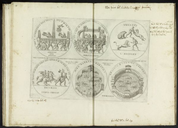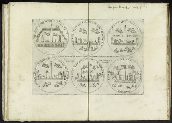 Curator: Let’s turn our attention now to this fascinating sheet of sketches from the late 16th century, attributed to Onofrio Panvinio, titled "Acht penningen met wagenmenners," which translates to "Eight Pennies with Charioteers." Editor: My immediate impression is how meticulous these tiny engravings are. The precision is striking. They feel almost like precious, miniature worlds, especially those scenes with chariots. Curator: Indeed. Executed in ink, these drawings imitate ancient Roman coins, a common practice among Renaissance scholars trying to understand antiquity through material culture. Each one captures the likeness of chariot races, rulers, and mythical creatures, reflecting the period's fascination with Rome's power and aesthetics. The materiality and making process are so meticulous. You can feel the skill involved in creating such minute details through engraving and drawing on such a small scale. Editor: Absolutely. And consider the sociopolitical implications—the visual language deployed in these coins reinforces hierarchical structures, lionizing imperial might and Roman statehood through the display of chariot races that served as important civic spectacles. What can a close analysis of them reveal about status, identity, and power relations in 16th-century Europe? Curator: An astute point. Moreover, examining who had access to such detailed representations also reveals the dissemination of power through accessible imagery. Who was consuming these sketches? Where were they being traded? Understanding these aspects illuminates a crucial layer to our viewing. Editor: The drawing becomes more than just a mere copy; it evolves into a lens that reflects a multifaceted historical landscape. The attention to the original model matters, but the present reading gives it its social and political significance, which we as present observers bring to it. Curator: Ultimately, considering the interplay between artistic skill, production methodology, and sociopolitical environment transforms how we engage with this work. Editor: Exactly. A piece to consider within intersectional dialogues on power, culture, and representation—across the centuries.