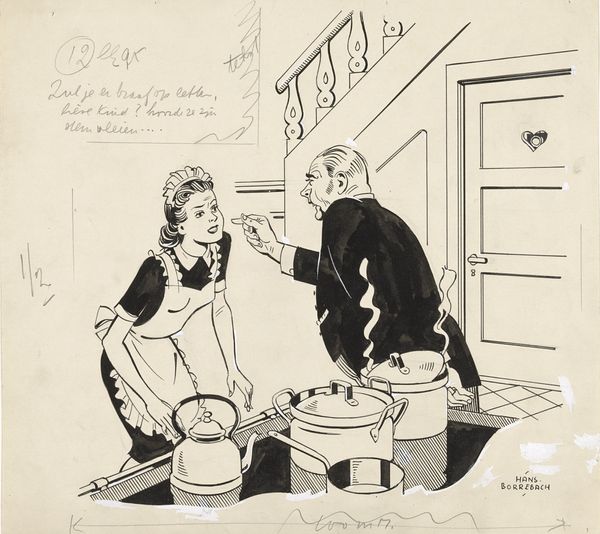 Hans Borrebach created "Lony kijkt naar twee verhuizers die een vleugel dragen" with ink and watercolor on paper. The composition strikes us with its interplay of bold, graphic lines and subtle washes of color. The cartoon-like figures, seemingly caught in a moment of strenuous labor, exude a certain dynamism. Borrebach's work often utilizes the interplay of lines, shapes, and tones to evoke a narrative. Here, the strong verticals of the piano contrast with the straining posture of the movers, creating a visual tension. The sparse use of color, primarily in the cool blues and greys, further emphasizes the weight and bulk of the piano. Borrebach destabilizes conventional notions of labor by juxtaposing the idealized form of the piano with the strenuous work of the movers. He prompts us to reconsider the semiotic values we associate with objects and labor. This interplay between form and content is where Borrebach’s drawing transcends mere representation and engages us in a broader cultural dialogue.