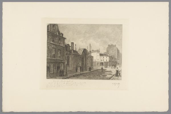Jean Théodore Joseph Linnig created this print, "Gezicht op de Palingbrug in Antwerpen," using etching techniques. At first glance, the eye is drawn to the intricate, detailed depiction of the architecture lining the street, evoking a sense of historical immersion. Linnig masterfully employs line and perspective to create depth, inviting us into the urban space. The varying densities of lines create shading and texture, giving the buildings a palpable sense of age and materiality. The composition is structured around the vanishing point beneath the bridge, drawing the eye deeper into the scene. This meticulous detailing and structural focus echoes the broader artistic concerns of representing urban life with a commitment to realistic precision. Consider how Linnig’s careful construction of space and form invites us to decode not just the visual components of the artwork but also the cultural codes embedded within its representation of 19th-century Antwerp. The artwork serves as a lens through which we can interpret the signs and symbols of urban life, recognizing its enduring capacity to spark new dialogues across time.